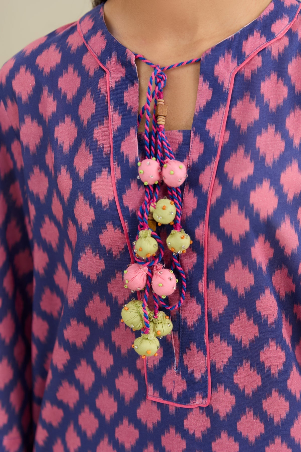 Round Neckline, Dori & Pompoms Details at Neckline, Full Sleeves, Printed Long Shirt